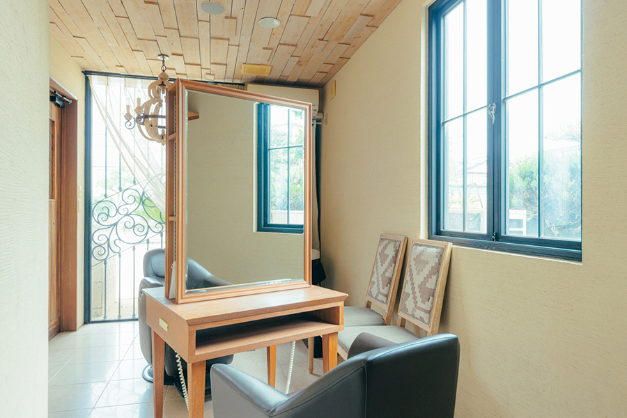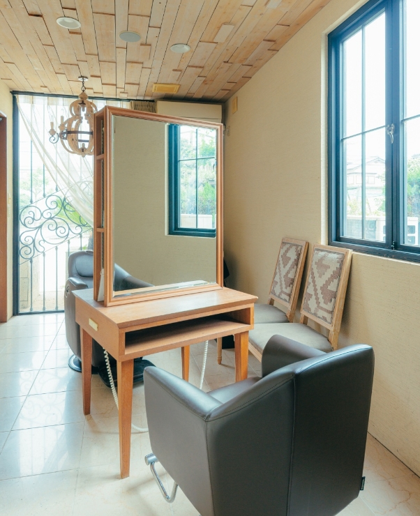 内装だけでなく、椅子などの家具にもこだわりました。木の色味と合わせたデザインで、全体のバランスもすごく気に入っています。実は、知り合いのサロンで使われていた椅子を参考にしたんですよ。細かいところも妥協せず、相談しながら決めていきました。